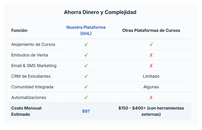 Las plataformas tradicionales solo alojan tus cursos. Nosotros te damos las herramientas de marketing y ventas para que tu negociocrezca de verdad, ahorrándote cientos de dólares al mes.
